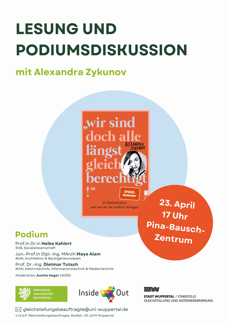 Die Podiumsdiskussion ist auf ca. 45 Minuten angelegt und wird bewusst dialogisch geführt werden. Neben Frau Zykunov nehmen Prof.in Dr.in Heike Kahlert (RUB), Jun.-Prof.in Maya Alam und Prof. Dr. Tutsch (beide BUW) an der Podiumsdiskussion teil. Prorektorin Prof.in Dr.in Rita Casale wird das Grußwort sprechen. Die Moderation wird von Annette Hager (WDR) übernommen.